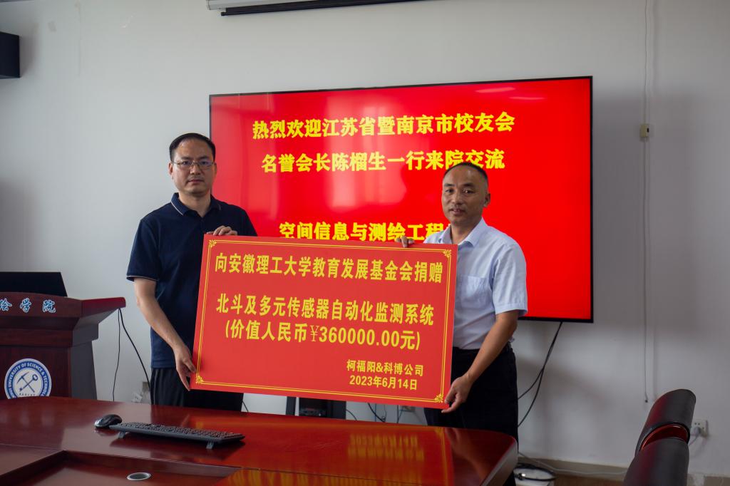 6月14日下午,江苏科博空间信息科技有限公司仪器及创新资金捐赠仪式在求本楼503会议室举行。校党委常委、副校长张平松出席捐赠仪式并讲话。采煤74级校友、南京化建产业集团原副局长陈榴生,地质83级校友、江苏煤炭地质局纪委副书记张宏安,电气89级校友、南京派光高速载运智慧感知研究院副总经理吴海君,测绘2000级校友、南京信息工程大学科技产业处副处长、江苏科博空间信息科技有限公司创始人柯福阳等校友一行8人,校合作发展处负责人,空间信息与测绘工程学院领导班子成员、部分教师代表参加了会议。会议由空间信息与测绘工程学院负责人主持。