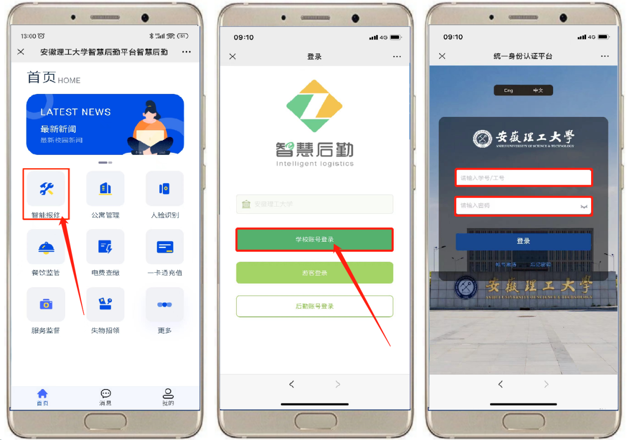 第二步:登录进主界面后,点击“智能报修”模块——选择“学校账号”登录,输入“统一认证”的账号密码。
