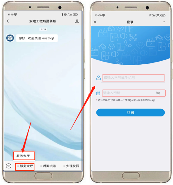 第一步:关注“安理工微后勤新版”公众号,即可在线进行报修。本平台采用实名登录,登录账号为“学号或工号”,首次登录采用初始密码(初始密码:姓拼音的第一个字母(大写)+学号或工号后四位+ #@)登录后系统会强制修改密码(注:请修改自己能记住的密码)。