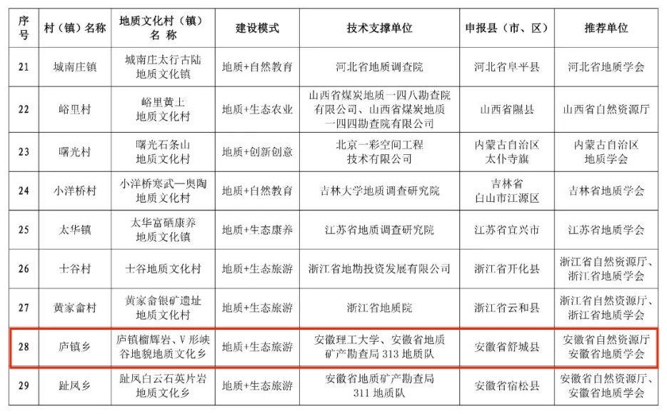 9月19日,中国地质学会公布了《第三批地质文化村(镇)评定结果》,由学校作为主要技术支撑单位申报的舒城县庐镇榴辉岩、V形峡谷地貌地质文化乡成功入选挂牌筹建全国地质文化村(镇)。