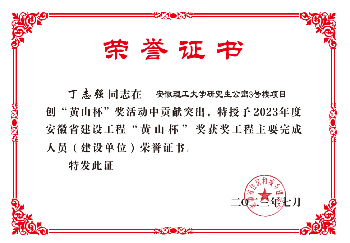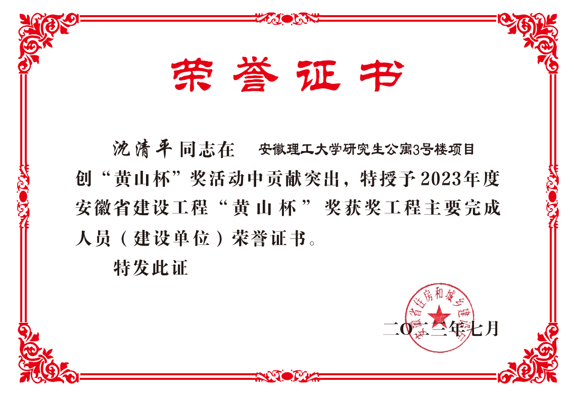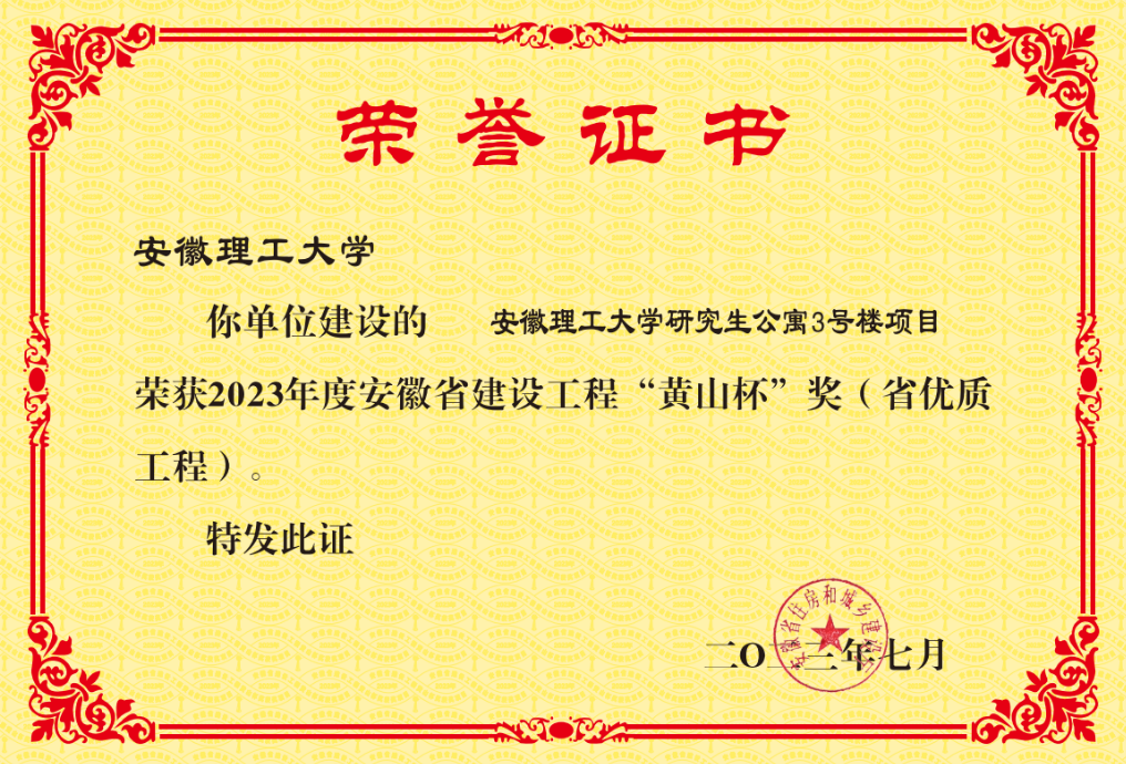 近日,学校研究生公寓3号楼项目荣获2023年度安徽省建筑行业建设工程质量最高荣誉奖“黄山杯”(省优质工程),丁志强、沈清平、李孝坤作为项目主要完成人受到表彰。
