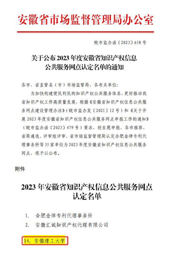 近日,安徽省市场监督管理局公布了2023年安徽省知识产权信息公共服务网点认定名单,我校成功入选。