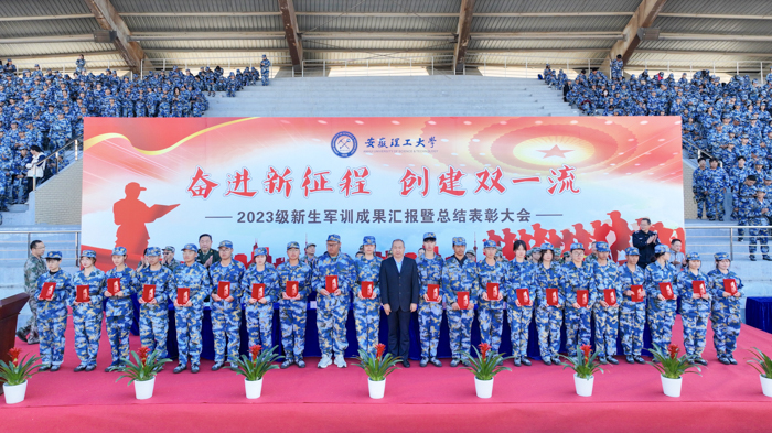 随着学生方阵摆出“10、9、8、7……”数字倒计时字样,军训汇报表演正式开始。花样操方阵摆出“校徽”“安理”“1945-2023”“78”“团结、奋进、博学、奉献”“砥砺新时代、创建双一流”“党徽”“中国地图”等字样和图案,抒发了2023级新生对党和国家以及学校的热爱之情,表达了对学校创建“双一流”的最真挚期许和祝福。