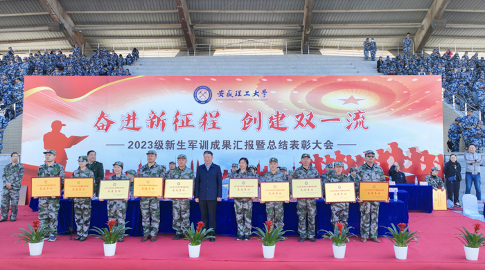王先江宣读了学校对军训期间表现突出的优秀学员、优秀内务寝室、优秀教导员、优秀教官、优秀国防教育征文获得者和队列会操优胜单位、军训先进集体的表彰决定。与会领导为获得表彰的先进集体和个人颁奖。
