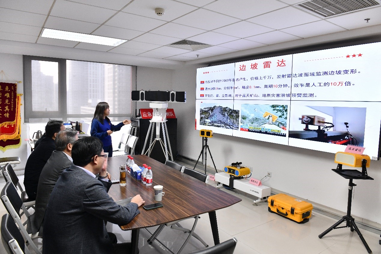 会前,袁亮院士一行在周福宝陪同下参观了边坡雷达创新团队、国家油气输送管道地理信息系统、职业健康防护技术装备以及安全生产风险监测预警中心。