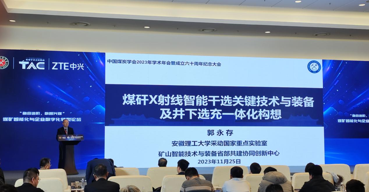 11月25日,由中国科学技术协会、中国煤炭工业协会指导,中国煤炭学会主办,安徽理工大学参与协办的中国煤炭学会2023年学术年会暨成立六十周年纪念大会在北京市国家会议中心隆重举行。校党委书记郭永存教授应邀出席开幕式并作题为《煤矸X射线智能干选关键技术与装备及井下选充一体化构想》的特邀报告。本次大会汇聚了13位两院院士和有关部委及政府领导同志,来自中国科协、煤炭行业相关企事业单位、科研院所、高等院校的负责同志、专家学者、科研人员等1100余人共同探讨和推动煤炭工业的高质量发展。
