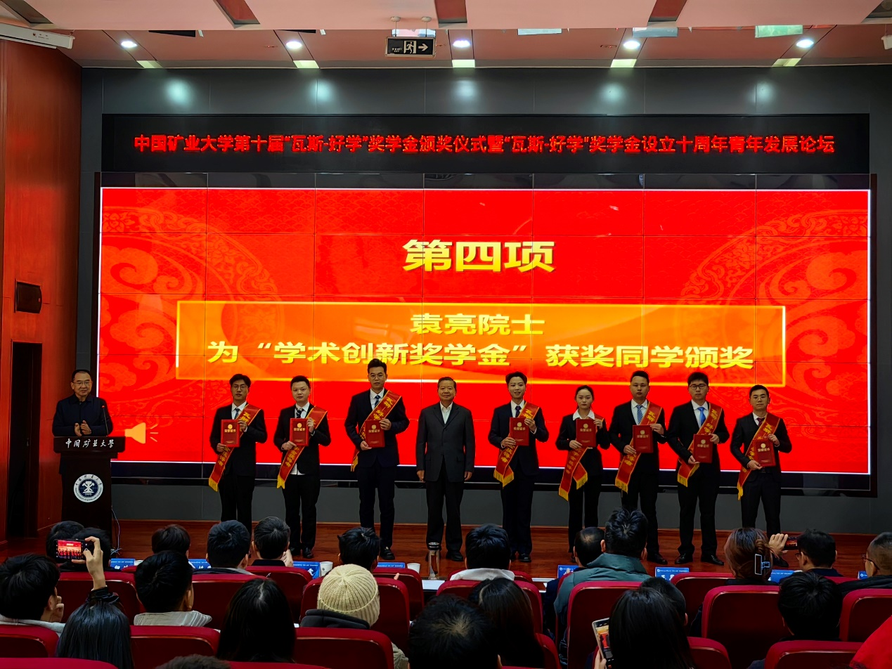 12月3日上午,袁亮院士捐资设立的“瓦斯-好学”奖学金第十届颁奖仪式在中国矿业大学举行。校党委副书记、校长袁亮院士出席仪式,为获奖同学颁奖并发表讲话。中国矿业大学安全工程学院党委书记、院长王恩元教授主持颁奖仪式。