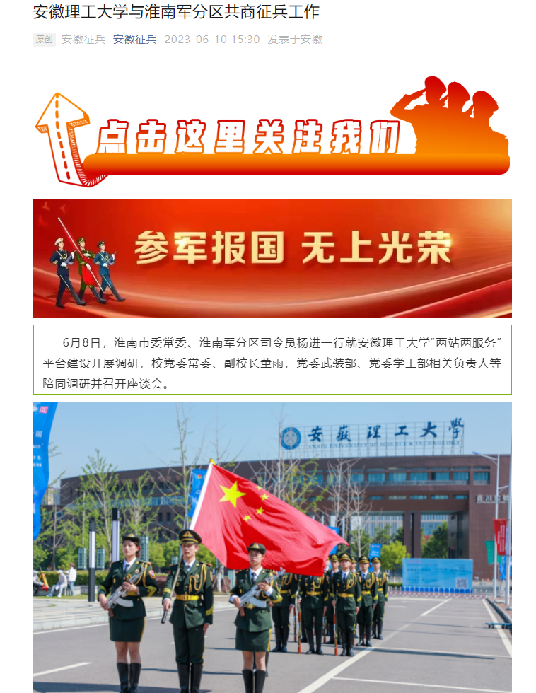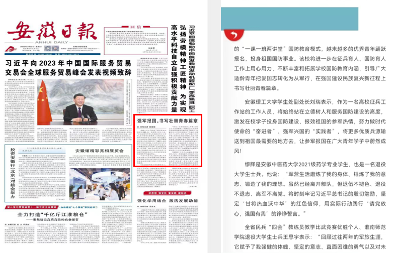 严实并进、压实责任。学校始终坚持目标导向,加强过程管理,综合研判兵源潜力,量化征集数量、宣传动员等任务要求,建立日常月调度、重点时段周推进制度,适时复盘分析,落实清单化闭环式管理。深化预征预储改革,建立国旗护卫队等3个军事社团,开展多样化、沉浸式的爱国主义教育、国防教育,为学校开辟了一个充盈的“兵源蓄水池”。学校的征兵工作也受到了媒体的广泛关注,我校2023年参军入伍的孙庆楠被央视CCTV7国防军事频道的《国防故事》栏目作为新兵典型报道,安徽日报头版和安徽征兵网陆续登载了学校征兵工作的特色做法和典型经验。
