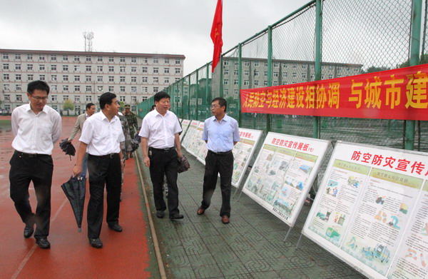 防空防灾预计疏散演练结束后,省、市领导和学校领导观看了宣传展板。