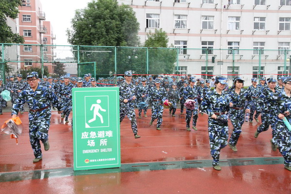 9时18分,防空警报试鸣暨疏散演练指挥长下达:鸣放警报命令,警报控制中心开始鸣放3分钟预先警报。校园上空一阵急促警报声骤然响起,参加军训的学生在军训教官引导下,快速有序疏散出教学楼、宿舍到达设在运动场的疏散聚集地蹲好。实验楼疏散人员,快速有序进入防空工程,按秩序坐好。9时25分,开始鸣放时长为3分钟空袭警报。空袭警报信号鸣响后,模拟受空袭造成建筑物倒塌、起火及人员伤亡,消防、医护人员接警后迅速前出,利用专业工具组织搜救、灭火及救护受伤人员。9时30分钟开始鸣放解除警报,参加疏散演练的学生听到信号,在人防引导员的引导下,有序撤出隐蔽人员,恢复正常生活。整个疏散过程环环相扣,有条不紊,学生服从指挥按照指定的线路以最快的速度疏散到预定集合点,“9.18”防空疏散演练达到了预期的效果,获得圆满成功。