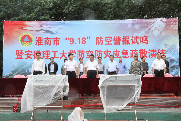 为纪念“九一八”事变83周年,9月18日上午,根据《安徽省实施<中华人民共和国人民防空法>办法》,省人大关于“9.18为全省防空警报试鸣日”规定,淮南市制定2014年度防空警报试鸣暨安徽理工大学防空防灾应急疏散演练方案,在我校北校区组织实施防空防灾应急疏散演练。校党委书记颜事龙、校纪委书记周峰,省人防办党组成员、纪检组长程乃耀,淮南市军分区参谋长郁智,市人防办主任马永陆及淮南市人防指挥部成员单位相关负责人等现场观摩了疏散演练。
