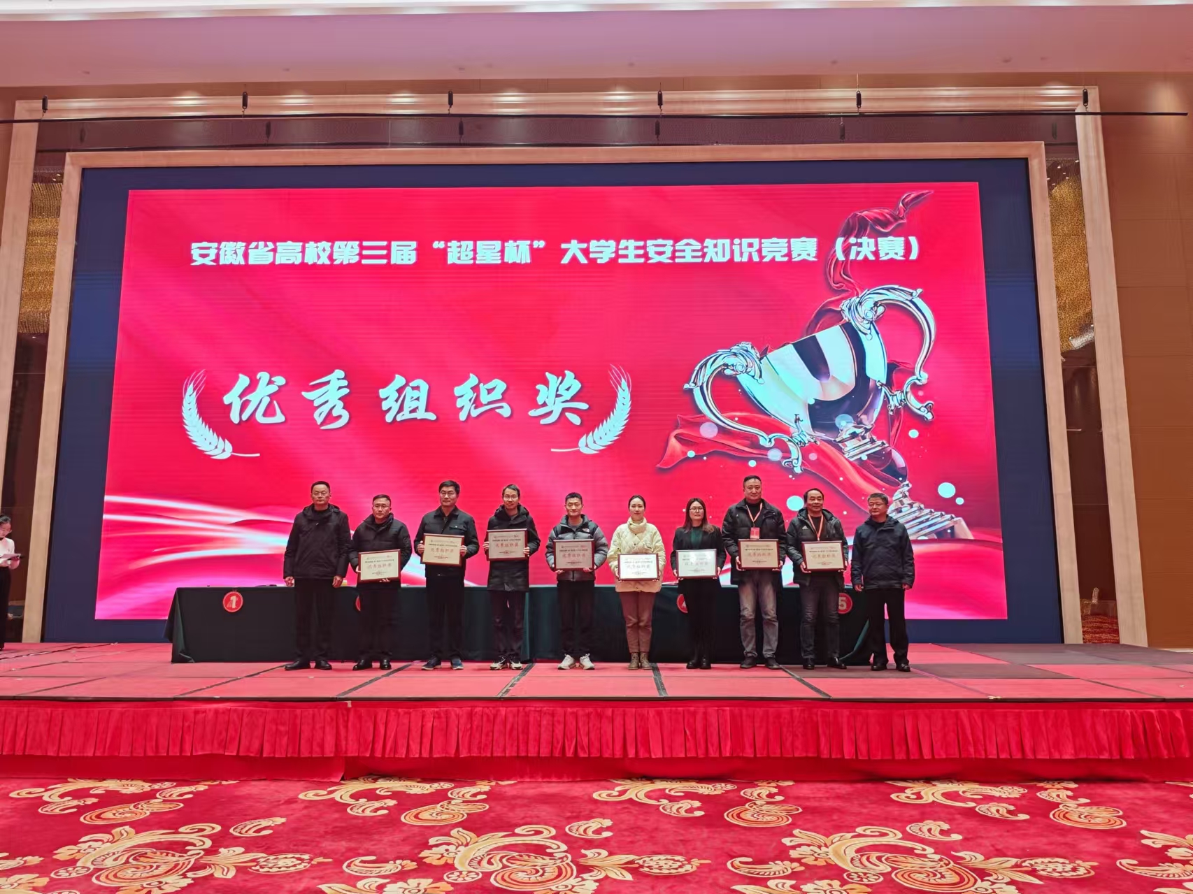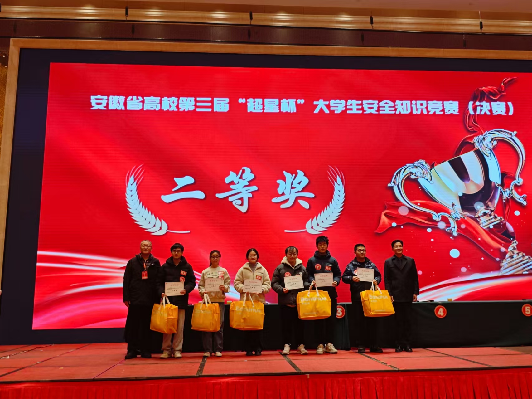 12月27日,安徽省高校第三届“超星杯”大学生安全知识竞赛决赛在蚌埠拉开帷幕。我校数学与大数据学院荣家晔、安全科学与工程学院党辛剑、机电工程学院李康同学荣获二等奖,学校荣获优秀组织奖。