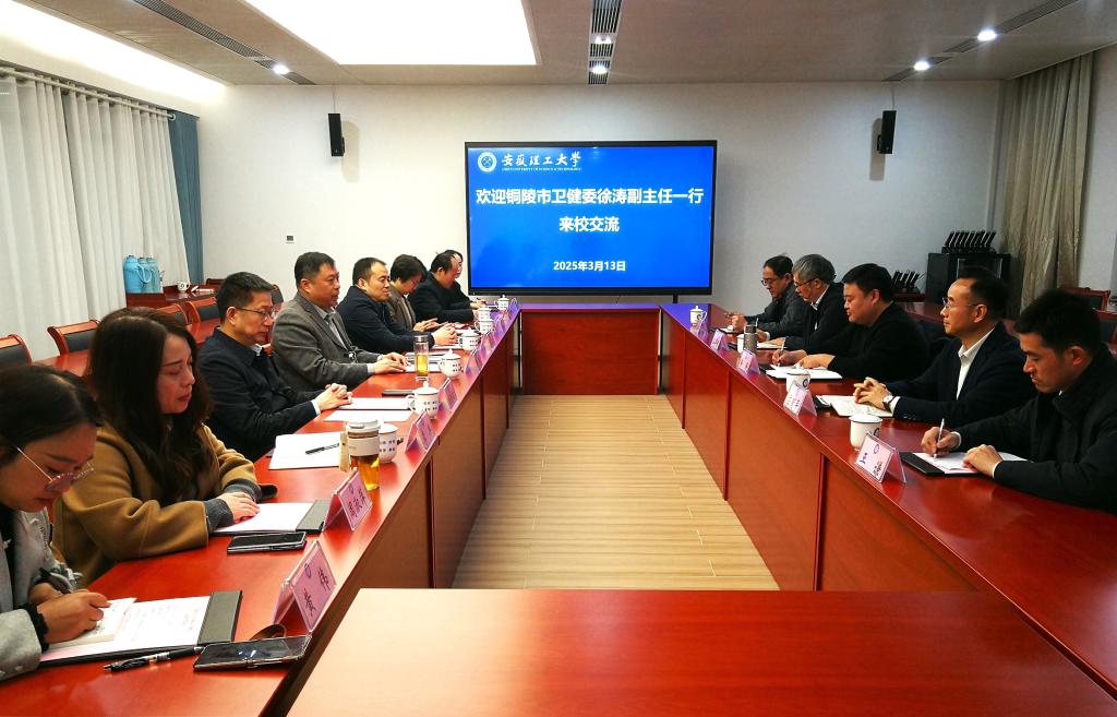 3月13日,铜陵市卫健委副主任徐涛一行来校交流,座谈会在学校420会议室举行。校党委常委、副校长、医学部主任鲁超出席会议。