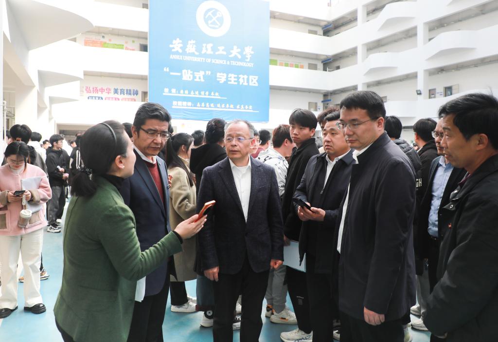 为进一步深化校-地-企多方合作,服务高校毕业生高质量就业,3月19日下午,“春暖皖江”2025年安徽共青团组织服务青年就业系列招聘会在学校厚德馆大厅成功举办。团省委书记陈明生、校党委书记郭永存到现场指导,校党委常委、副校长董雨陪同参观调研。