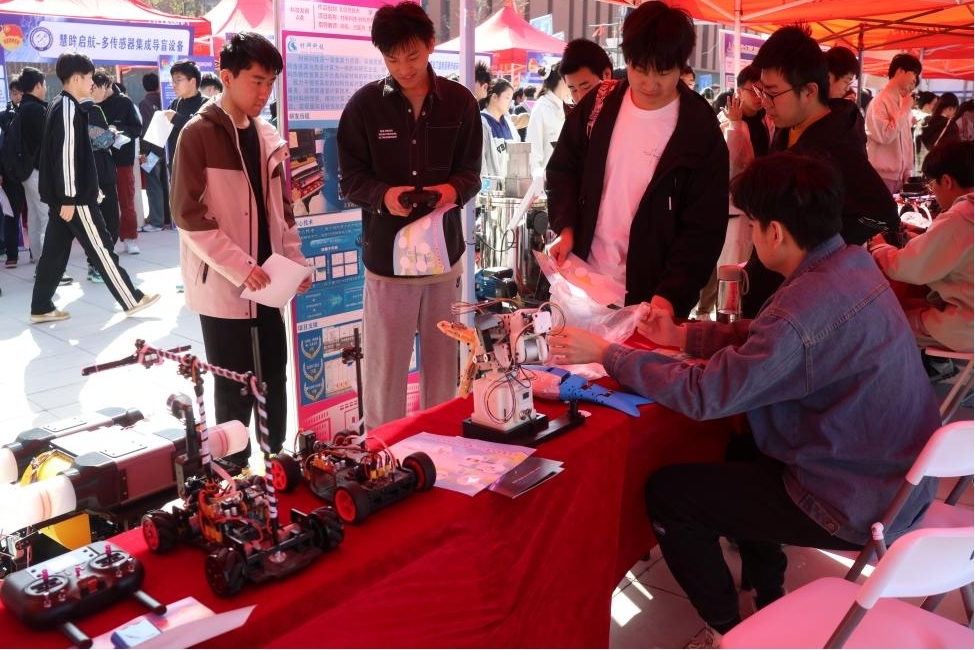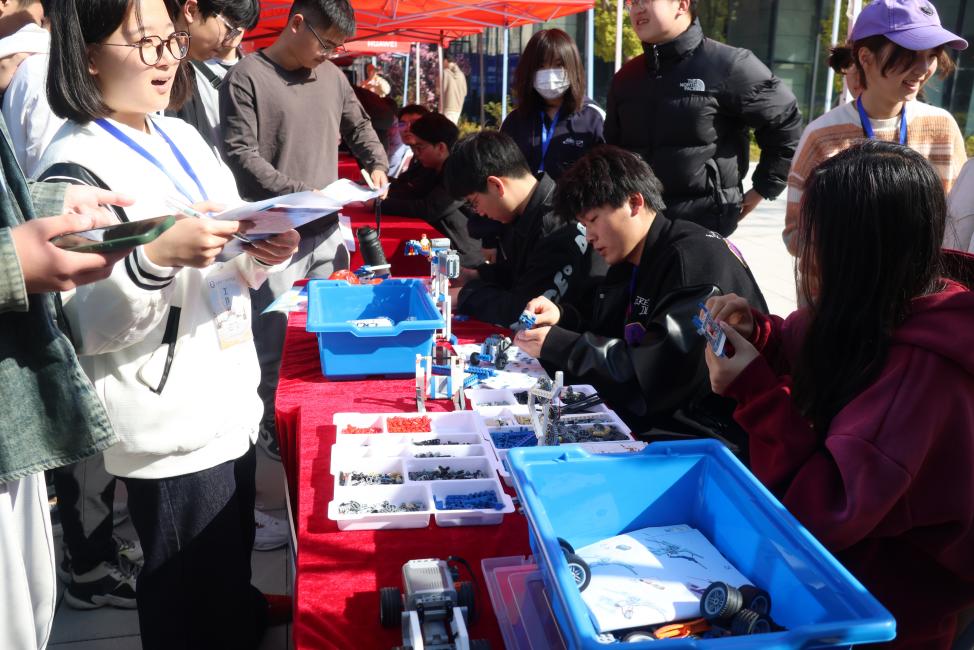 活动现场,设置了18个展示区域,包括校内科创成果、科技类社团、无人驾驶车辆、无人机、编程机器人等区域,吸引了2000余名师生参与活动,通过“相互学习、经验共享”的方式,激发学生科创和AI热情,达到以展促学破壁垒。