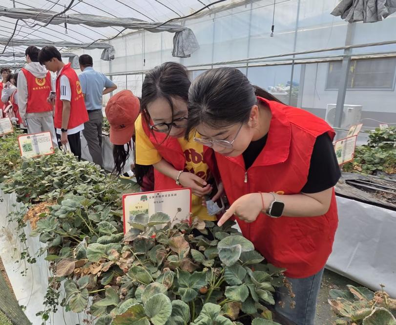 学生在观察草莓长势特点(摄影由地环团委提供)