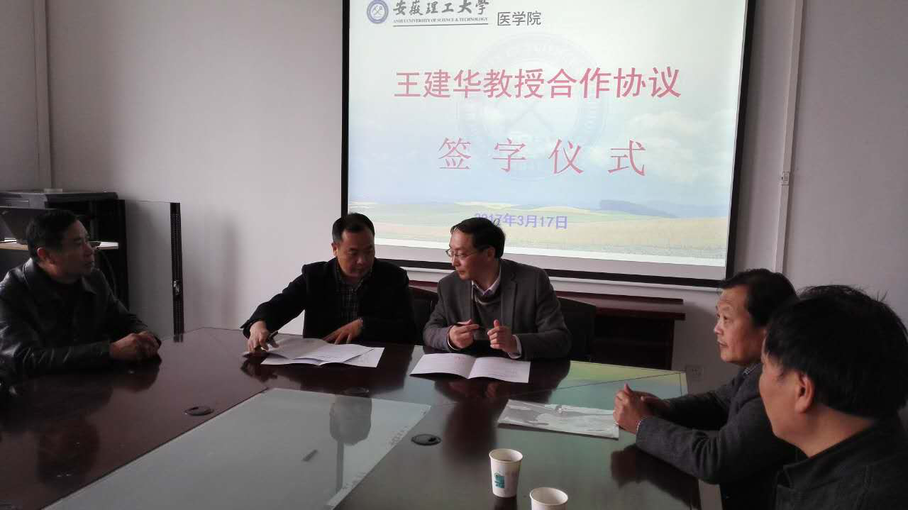 会见前,王建华与学校签订了聘任合作协议,并面向医学院教师、研究生代表作了题为《肿瘤微环境中标志物检测及意义》的报告。