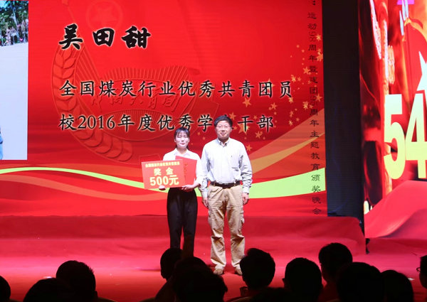 在晚会现场,校领导还分别为安徽省第20届五四青年奖章、安徽好人、安徽省十佳大学生、全国优秀共青团员、全国煤炭行业优秀共青团员、全国高校活力团支部等一批先进集体和个人颁奖。