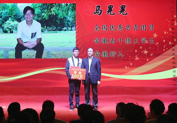 校党委常委、副校长郑明东为全国优秀共青团员、安徽好人、安徽省十佳大学生机械制造及其自动化2013-3马晃晃颁奖(摄影:王嫦欢)