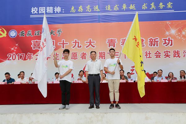 7月5日上午,学校2017年大学生志愿者暑期“三下乡”社会实践活动出征仪式在厚德馆大厅举行。副校长宫能平出席仪式并为国家重点团队授旗。校党委组织部、党委宣传部、教务处、科技产业处、党委研究生工作部、党委学生工作部、毕业生就业工作处、财务处、校团委等职能部门负责人,马克思主义学院主要负责人,各学院党委副书记、团委书记,“三下乡”实践团队师生代表近400人参加了出征仪式。
