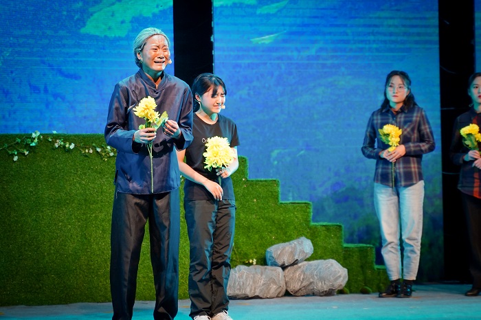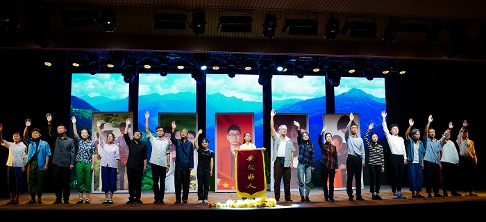“一条山路百转千回,一片热土洒下多少汗水,风雨里有你坚定的脚步,一片丹心无怨无悔……”演出在该剧原创主题曲《丰碑》荡气回肠的歌声中圆满落幕。现场掌声雷鸣、经久不息,师生们饱含热泪,无不对刘扬彧的感人事迹和同学们的深情演绎点赞称颂。