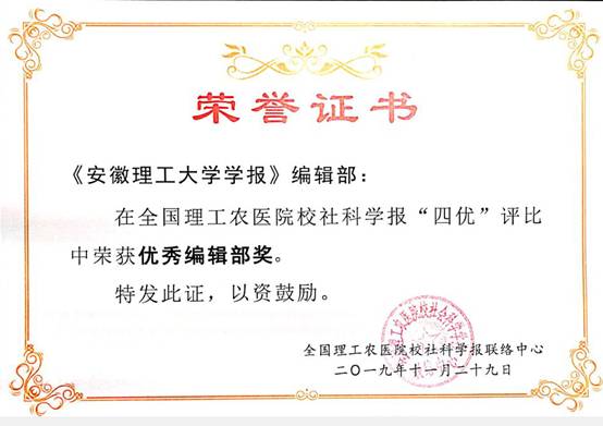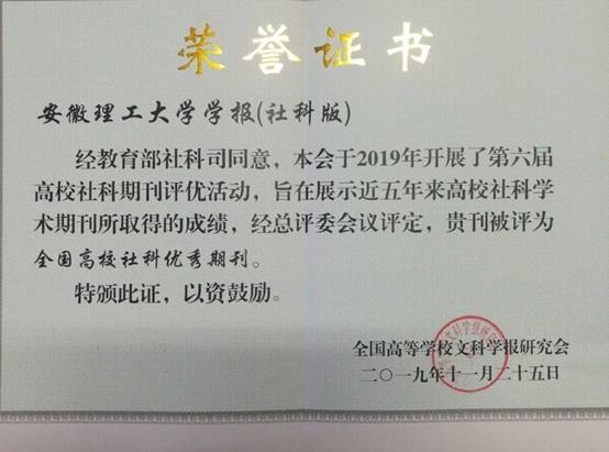 11月26日至27日,全国高等学校文科学报研究会第八届理事会第五次会议在广东肇庆召开,会上公布了“第六届全国高校社科期刊评优活动”获奖名单。我校主办的学术期刊《安徽理工大学学报(社会科学版)》被评为“全国高校社科优秀期刊”;吴晓红副编审被评为“全国高校社科期刊优秀编辑”。11月29日至30日,全国理工农医院校社科学报联络中心2019年会员代表大会暨学术年会在广州召开,会议公布了2019年“四优”评比获奖名单,《安徽理工大学学报(社会科学版)》编辑部获评“优秀编辑部”;吴晓红、范君两位副编审获评“优秀编辑”奖,吴晓红同时获评“优秀编辑学论著”奖。