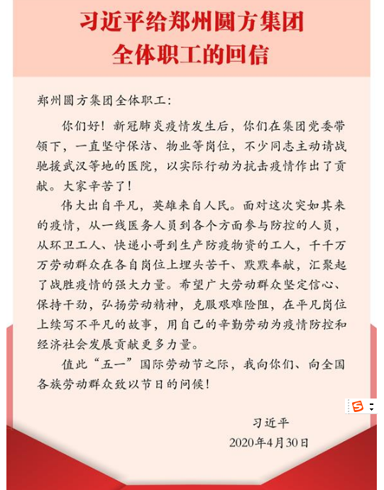 在“五一”国际劳动节来临之际,中共中央总书记、国家主席、中央军委主席习近平4月30日给郑州圆方集团全体职工回信,向他们并向全国各族劳动群众致以节日的问候。