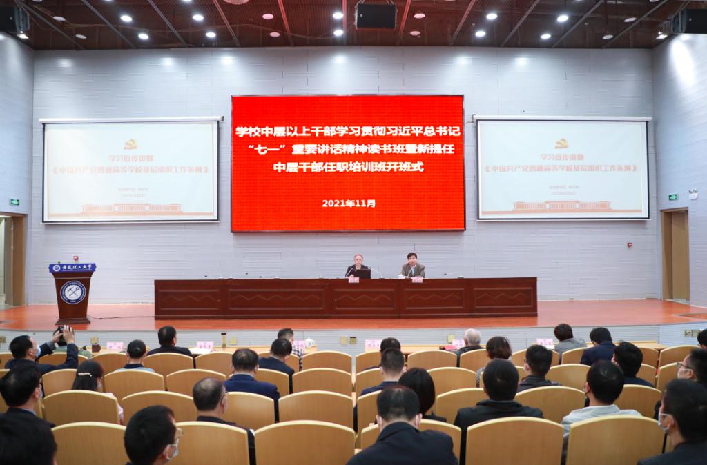 为进一步深入学习贯彻习近平总书记“七一”重要讲话精神,落实习近平总书记在2021年中央党校(国家行政学院)秋季学期中青年干部培训班开班式上对年轻干部的殷切期望,培养造就忠诚干净担当的高素质专业化干部队伍,11月1日下午,学校中层以上干部学习贯彻习近平总书记“七一”重要讲话精神读书班暨新提任中层干部任职培训班在舜耕会堂开班,校党委书记郭永存作动员讲话并作首场专题辅导报告。校党委副书记、常务副校长虞宝桃主持会议,在校校领导孟祥瑞、郑明东、宫能平、梁立昌、周旭等出席会议。
