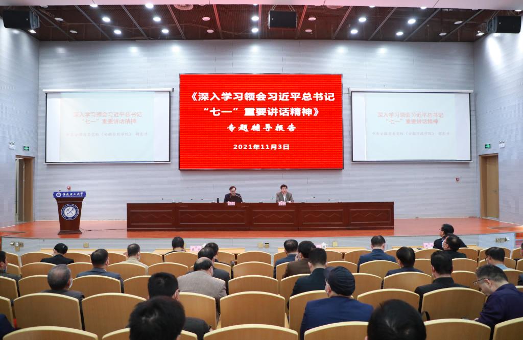 11月3日下午,省委党校胡东升教授受邀来校,在舜耕会堂作《深入学习领会习近平总书记“七一”重要讲话精神》的专题辅导报告,校党委副书记、常务副校长虞宝桃主持报告会,在校校领导董雨、周旭出席报告会。