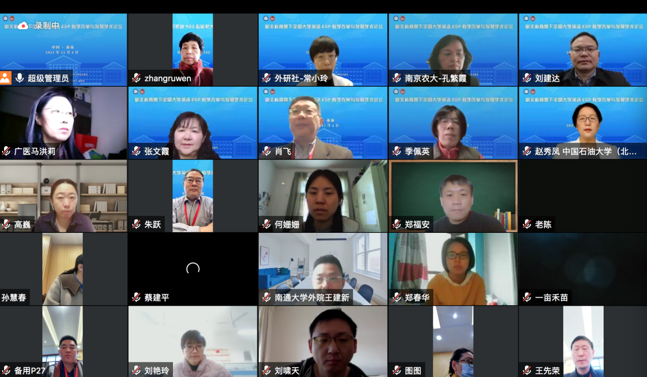 在之后的专家论坛中,教育部高等学校大学外语教学指导委员会副主任委员、广东外语外贸大学副校长刘建达教授,教育部高等学校大学外语教学指导委员会副主任委员、清华大学张文霞教授,南京林业大学和安徽理工大学肖飞教授,中国石油大学(北京)赵秀凤教授,教育部高等学校大学外语教学指导委员会委员、复旦大学季佩英教授,教育部高等学校大学外语教学指导委员会委员、广东工业大学陈晓茹教授,外研社高等英语教育出版分社闫妍经理,南京农业大学孔繁霞教授,安徽理工大学雷鹏飞教授九位国内ESP教育研究领域知名专家学者分别从新文科背景下大学英语ESP课程建设、课程定位与内涵、教材建设、课程思政与人才培养、教师队伍建设和能力研究等不同角度细致阐述了当前国内高校ESP教育教学现状,共商问题与对策,展望专门用途英语良好的发展前景。