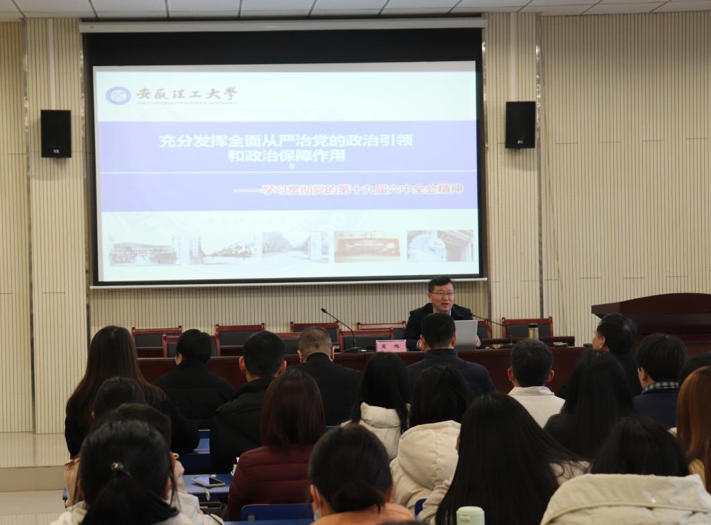 12月23日下午,校党委常委、纪委书记、监察专员周旭在明道楼一楼报告厅为数大学院师生党员作了题为《充分发挥全面从严治党的政治引领和政治保障作用——学习贯彻党的十九届六中全会精神》的专题辅导报告。学院领导班子成员、师生党员共计110余人聆听了报告。