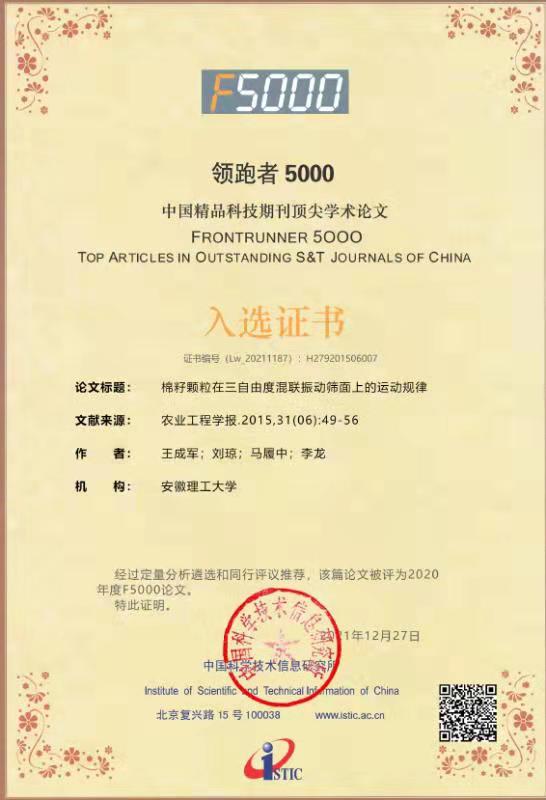 12月27日,中国科学技术信息研究所在北京发布了《2021年中国科技论文统计报告》。人工智能学院王成军教授于2015年8月发表在EI检索期刊《农业工程学报》上的《棉籽颗粒在三自由混联振动筛面上的运动规律》论文,荣获“领跑者5000-中国精品科技期刊顶尖学术论文”(简称“F5000”)。论文研究和揭示多维振动筛筛面物料运动规律和透筛机理,对进一步研究多维振动筛分机理、研制三自由度混联振动筛产品样机等提供了参考。