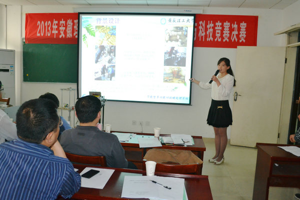 5月10日下午,以“节能减排、绿色能源”为主题的2013年安徽理工大学“大学生节能减排社会实践与科技竞赛”决赛,在校本部实验中心11楼报告厅顺利举行。此次大赛由教务处、研究生处、后勤资产管理处、实验室与设备管理处、学生工作处、校团委、机械工程学院主办,并由机械工程学院承办。