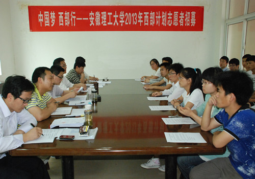 5月28日下午,我校2013年西部计划志愿者招募面试工作在大学生素质教育中心会议室举行。校团委、毕业生就业工作处、学生工作处等职能部门老师担任了评委。