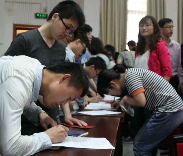在活动最后,贷款毕业生们纷纷在《安徽理工大学2013届贷款毕业生诚信承诺书》上签下了自己的姓名,庄重承诺:向学校和银行所提供的材料客观、真实、有效,绝无虚假;珍惜并保持自己本人良好的征信记录,保证在今后的工作和生活中做到遵纪守法、诚信做人、爱岗敬业;积极主动与银行签订还款协议,及时提供毕业的具体去向及有效联系方式,在贷款本息未偿还完之前与银行保持正常的联系;毕业后切实履行银行借款合同和还款协议上的各项条款及有关规定,按时偿还贷款本息;按还款协议进入还款期后,如连续拖欠还款超过一年且不与经办行主动联系办理有关手续,致使助学贷款形成风险的,自己愿接受经办行采取的债权保护措施,依照合法的法律途径和程序追回贷款。