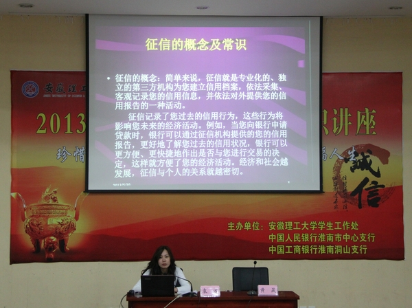 5月30日上午,由我校与中国人民银行淮南市中心支行、中国工商银行淮南洞山支行共同主办的“珍爱信用记录 提高信用意识 享受幸福人生”征信知识进校园暨2013届贷款毕业生征信知识宣讲活动在六角楼报告厅举行,中国人民银行淮南市中心支行袁方、中国工商银行淮南洞山支行行长朱晓伟等银行相关部门负责人以及全校贷款毕业生代表近300人参加了本次活动。活动由校学生处副处长黄晟主持,分“征信基础知识讲座、最新金融基础业务知识介绍、互动环节、贷款毕业生诚信承诺签字”四个部分进行。