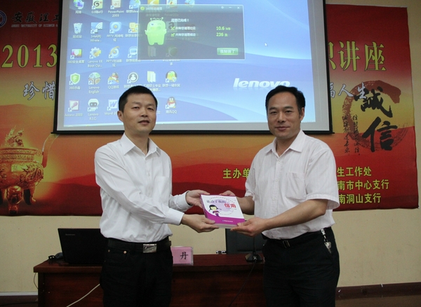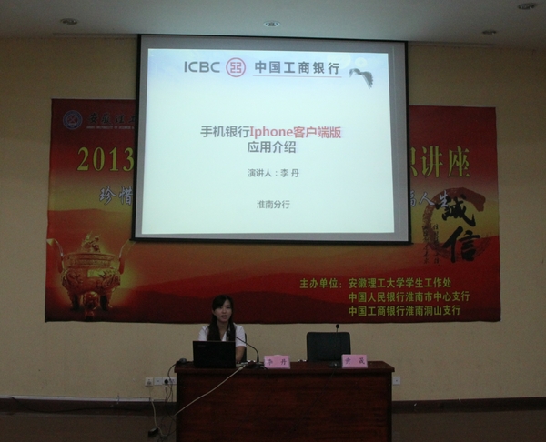在征信基础知识讲座中,人行淮南市中心支行袁方老师从“征信的概念及常识、个人在征信活动中的权利和义务、为什么说个人信用报告是个人的经济身份证、如何避免负面信息、个人征信的一些误区、征信为什么需要监管、国外征信情况、人民银行征信体系建设情况”等八个方面,并结合她自身的经历和体会详细地向毕业生们阐述了珍爱信用记录、提高信用意识的重要性,提醒和建言毕业生们在走出校门之后如何健全、完善和保持好自己良好的征信记录,从而为自己的生活、工作创造有利的环境,享受幸福人生。为使即将离校的毕业生更好地适应社会经济生活,工行淮南洞山支行李丹老师在活动现场为大家介绍和演示了“手机银行IPHONE客户端版应用” 的最新金融基础业务知识。在互动环节,工行淮南洞山支行向参加活动的学生发放了金融和征信知识宣传画册,并向校学生处赠送了“大学生金融与征信生活实用宝典”——《谁动了我的信用》一书,为学生处在今后的工作中向贷款学生解读金融和征信知识提供了有力的支撑。