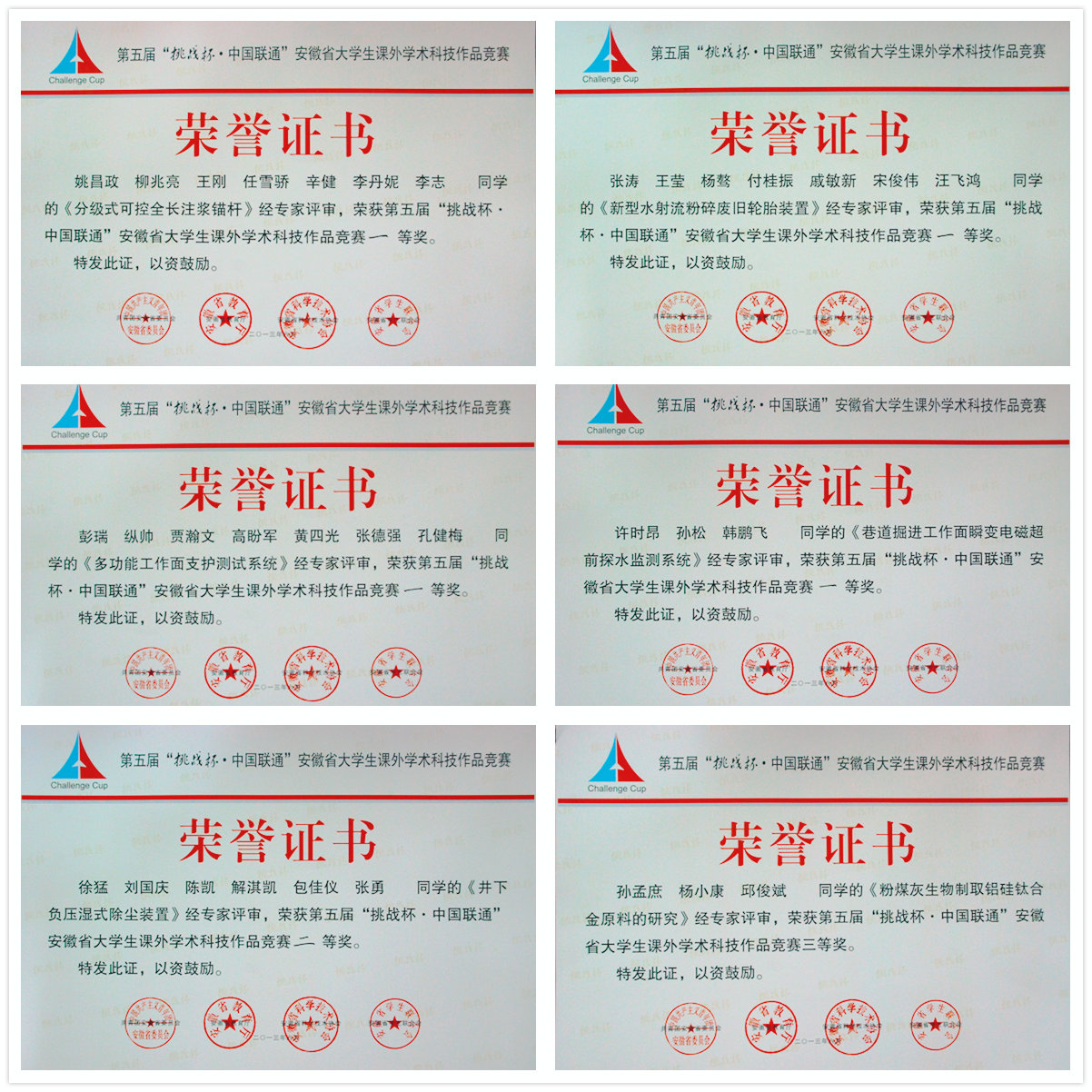 通过作品PPT展示、专家问辩等评审环节,我校选送的《分级式可控全长注浆锚杆》(作品来源:能源与安全学院,指导教师:张向阳,团队负责同学:姚昌政)、《多功能工作面支护测试系统》(作品来源:能源与安全学院,指导教师:赵光明,团队负责同学:彭瑞)、《新型水射流粉碎废旧轮胎装置》(作品来源:机械工程学院,指导教师:刘萍,团队负责同学:张涛)、《巷道掘进工作面瞬变电磁超前探水监测系统》(作品来源:地球与环境学院,指导教师:张平松,团队负责同学:许时昂)等4件作品获得一等奖,《井下负压湿式除尘装置》(作品来源:机械工程学院,指导教师:王开松,团队负责同学:刘国庆)获得二等奖,《粉煤灰活化除铁制备硅钛铝合金的工艺研究》(作品来源:化学工程学院,指导教师:邵群,团队负责同学: 邱俊斌)获得三等奖。学校摘得大赛“优胜杯”。