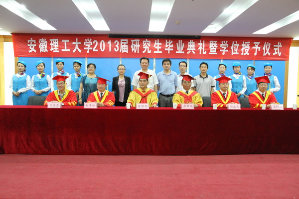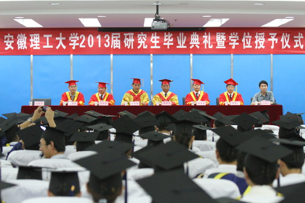 6月25日上午8:00,学校在校本部九楼报告厅隆重举行2013届研究生毕业典礼暨学位授予仪式。校党委书记张明旭、校长颜事龙,副校长刘泽功、郭永存、王其东、孟祥瑞等出席典礼和仪式,并为毕业研究生授予学位。校党政办公室主任张海军、研究生(部)处长高明中分别主持毕业典礼和学位授予仪式。