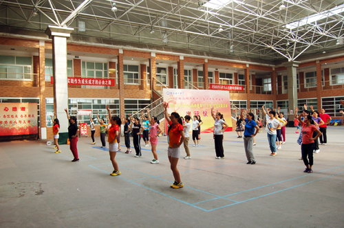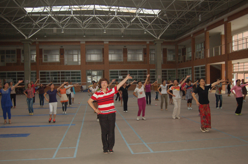 虽然学员们大部分是没有舞蹈基础或文艺特长的普通教职工,但是她们钟情舞蹈,热爱健身,每天早来迟走,连中间的休息时间也不放过。场上,大家排成几列,随着音乐的节拍,时而转圈,时而扭腰,虽然不能完全做到整齐划一,但一举手、一头足,已经有模有样,与欢快轻松的舞曲相得益彰。场下,她们三个一组,五个一群,围在一起讨论步伐、熟悉动作。凭着对舞蹈的热爱和认真的学习态度,通过紧张的短暂培训,大家迅速掌握了动作要领。
