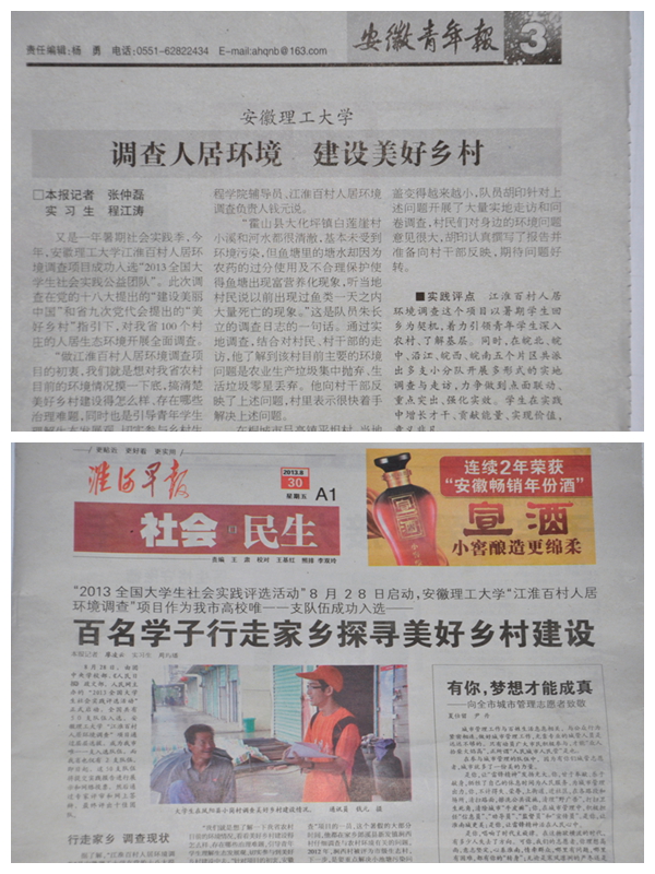 今年暑期,由我校化学工程学院团委策划组织的江淮百村人居环境调查团队入选“青年人•中国梦--2013全国大学生社会实践公益团队”,100多名同学在安徽百余个村庄开展了环境调查与走访,了解美好乡村建设情况,在公益实践中追寻服务社会、锻炼能力双重价值的实现,受到人民网、《安徽青年报》、《淮河早报》、中国大学生在线、淮南报业新闻网等多家媒体关注。