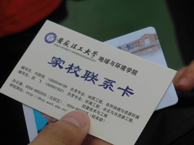 这是地球与环境学院2013级迎新现场,家长领到的“家校联系卡”上的一段话,卡上记录了辅导员老师的手机号、办公室电话、学院网址等联系方式。质朴的语言,表达出一种迫切希望家长和学校共同培养学生的愿望,传递了一种对学生的关爱,对家长的承诺。