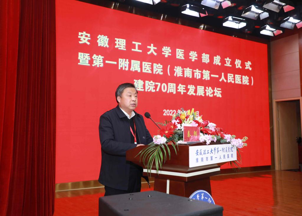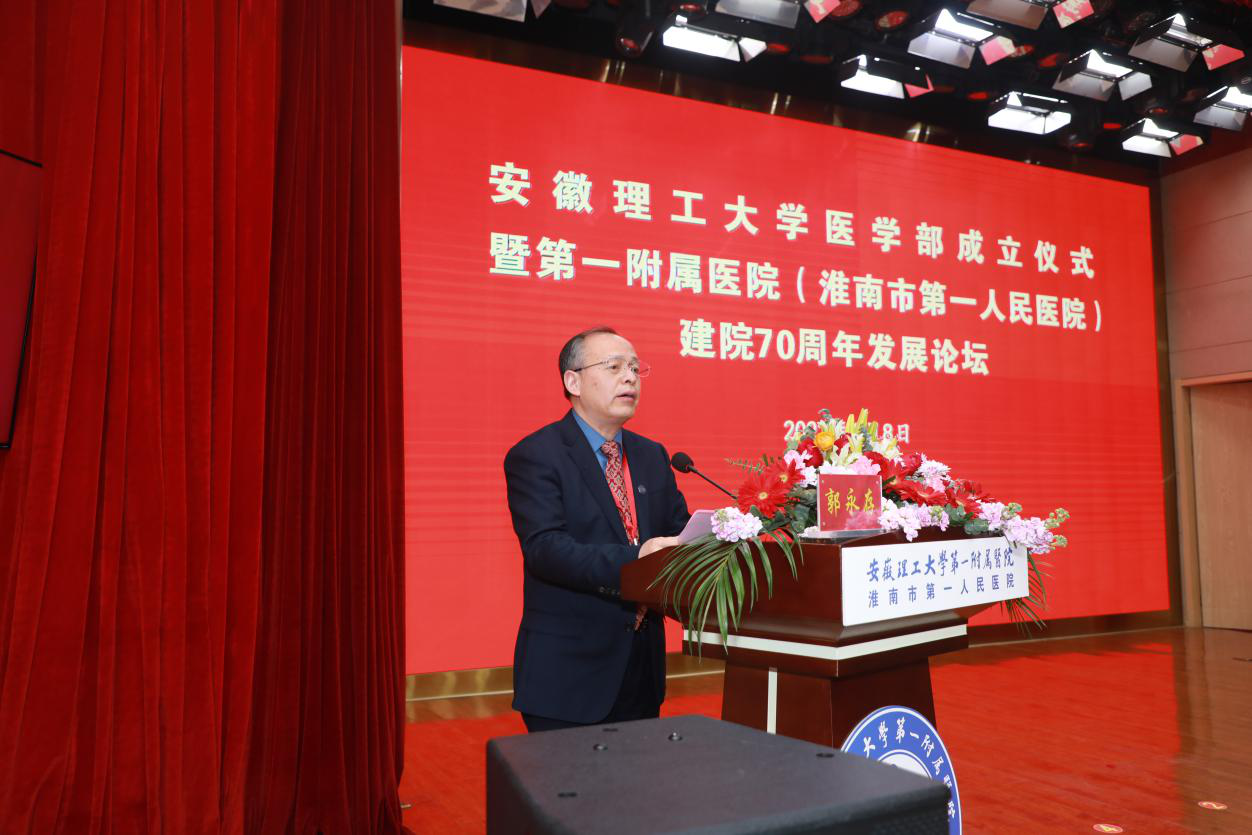 郭永存代表学校,向各位领导、嘉宾的到来表示欢迎!向长期关心支持学校第一附属医院和医学教育事业发展的各界朋友表示感谢!向医院全体职工表示祝贺!他指出,70年栉风沐雨。如今,医院作为淮南市唯一的公立综合性三甲医院,初步搭建“互联网+医疗健康”便民惠民服务体系。新冠肺炎疫情发生以来,全体医护人员冲在疫情防控第一线,成为淮南公共卫生事业的“压舱石”、人民生命健康的“守护者”。当前,全校上下正在以党的十九届六中全会和省第十一次党代会精神,指导实践、推动工作。站在建院70周年的新起点上,学校将紧紧扭住学科建设这个龙头,奋力打造医工交叉学科高峰,深化理工医融合、医教研协同发展,打造“职业安全健康”医工交叉学科高峰;紧紧扣住立德树人这个根本任务,提升人才培养质量,培养和输送更多高素质的医学科技创新人才;紧紧围绕“四个融入”这个发展战略,全面提高医疗社会服务能力,不断汇集优质高端医疗资源,打造区域医学中心,奋力为淮南高质量转型发展和“三地一区”建设作出新的更大贡献,以实际行动迎接党的二十大胜利召开!