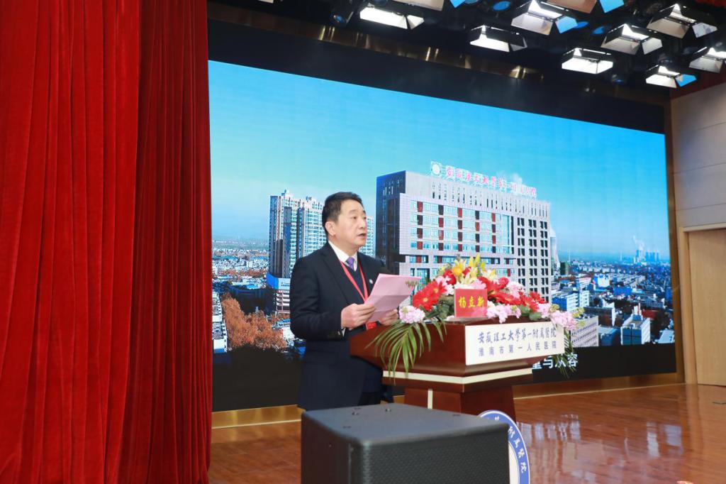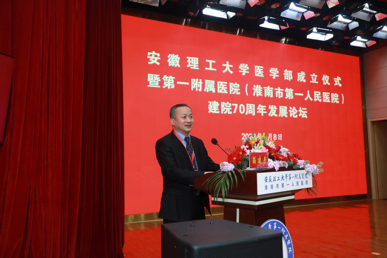 许戈良代表安徽省医院协会向学校第一附属医院全体干部职工致以最热烈的祝贺!他指出,经过70年的建设与发展,学校第一附属医院(淮南市第一人民医院)已发展成为集医疗、教学、科研为一体的创新型现代化医院。70年来,学校第一附属医院(淮南市第一人民医院)始终秉承着求真务实、努力拼搏、敢为人先、与日俱进的精神,步履日愈矫健;魅力正在彰显;更加自信成熟。相信在安徽理工大学和淮南市双平台的领导和支持下,医院将实现从办医理念到治理体系、从融入长三角到承接前沿学科技术、从人才引育到科技创新的全方位裂变。在打造安徽省区域医学中心、合肥都市圈临床医学副中心,努力服务健康安徽、健康中国建设进程中再谱新的篇章!