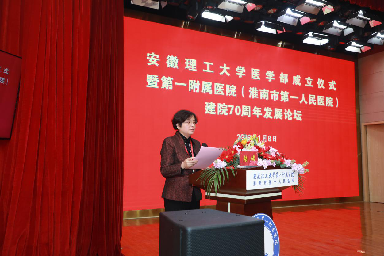 陆晞代表淮南市人民政府向医院建院70周年表示祝贺,向关心和支持淮南卫生事业发展的各级领导、社会各界朋友表示衷心的感谢!她指出,七秩守初心,仁心向未来,学校第一附属医院(淮南市第一人民医院)是淮南市公立医院旗舰,为淮南市卫生事业发展作出了重要贡献。去年,医院整建制划转到安徽理工大学成为学校第一附属医院,这是省委省政府战略举措,有利于更好服务淮南市乃至安徽省人民身心健康。希望淮南市第一人民医院以建院70周年为契机,抢抓长三角医疗卫生一体化发展等战略机遇,加快高质量发展步伐,更好为淮南百姓造福;发挥大型公立医院中坚和排头兵作用,做好公立医院综合改革和现代医院制度试点工作,努力提高医疗服务质量和服务水平。她表示,市政府将继续关心学校第一附属医院的成长,助力医院打造省内区域医疗和教育中心,为健康淮南再立新功。共同奋力谱写淮南市卫生健康事业高质量发展新篇章。