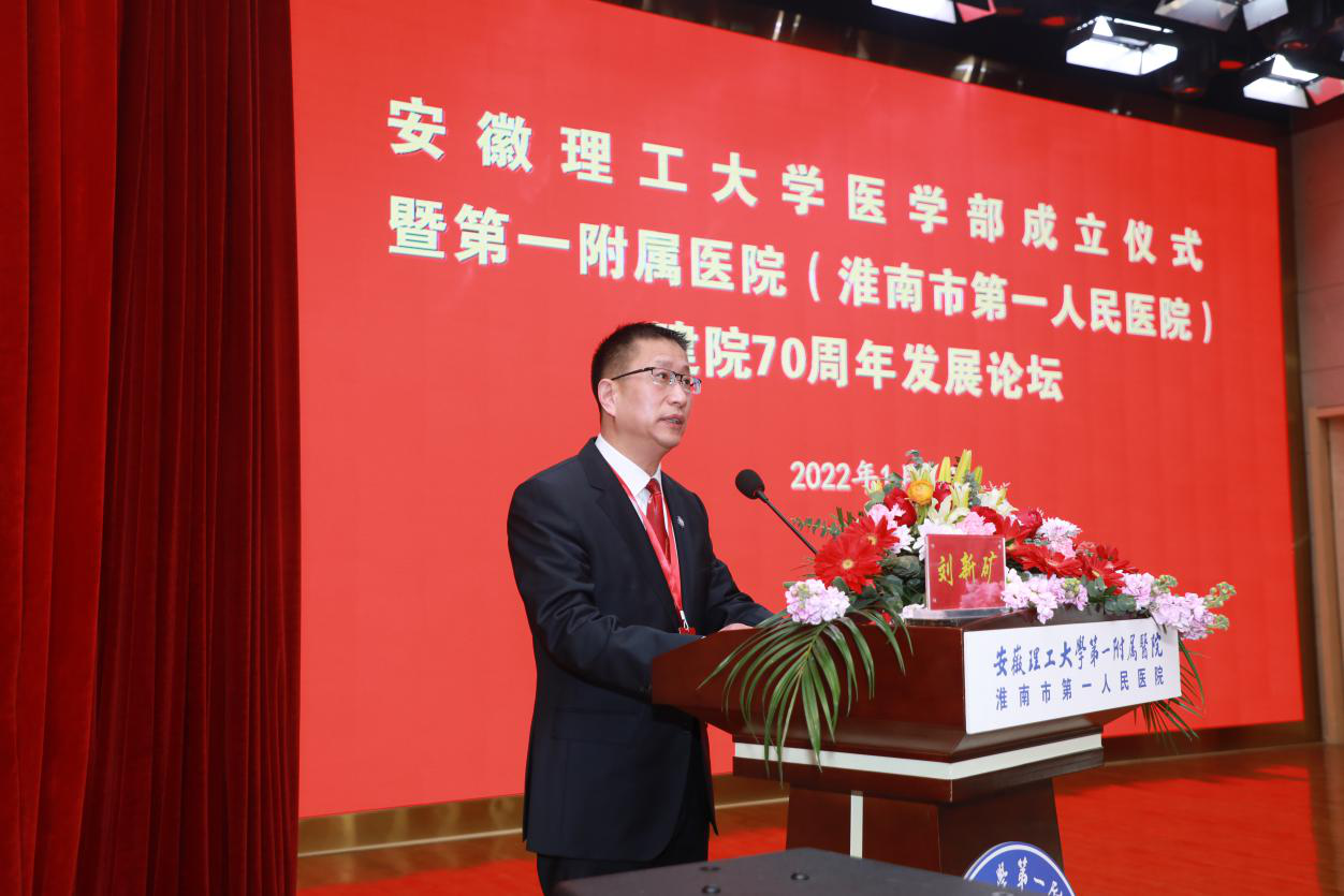 校第一附属医院(淮南市第一人民医院)党委副书记、执行院长刘新矿发言,他表示,70周年是重要历史节点,是新的历史起点,医院将进一步坚持贯彻医教协同发展战略,在校医学部统筹下,着力壮大提升学科团队、狠抓重点突破、引领全面提升,加快医院高质量发展步伐,助力“双一流”建设。着力促进教学和临床医疗等方面更加紧密协同发展,建设医学教学新高地,打造区域医疗教育中心,努力把我院打造成一所综合功能齐全、专科特色突出、内涵底蕴丰厚、就医环境优美、社会和患者满意度高、辐射力和影响力高的一流的现代化医院。