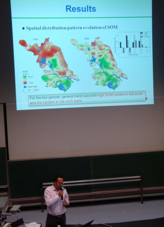 国内来自中国科学院南京土壤研究所、中国科学院地理科学与资源研究所、中国农业大学、沈阳农业大学、安徽理工大学、河南农业大学等多位同行参加了此次国际学术盛会。我校测绘学院教师赵明松博士参加此次会议,并在第一分会场作了题为“Spatial-Temporal Variability of Soil Organic Matter and Driving Forces in Jiangsu, China”的学术报告;报告以江苏省为例,分析讨论了自上世纪80年代以来近30年江苏省土壤耕作层有机质含量时空演变特征及其驱动机制。