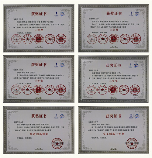 另外,大赛组委会为鼓励各高校赛后对参赛作品作进一步的技术完善和革新,开展跨学科学术研究和人才培养,还特地设立了“累进创新奖”和“交叉创新奖”。我校申报的《智能型矿用气动水射流除尘设备》和《巷道掘进工作面瞬变电磁超前探水监测系统》两件作品还分获了“累进创新奖”铜奖和“交叉创新奖”三等奖。
