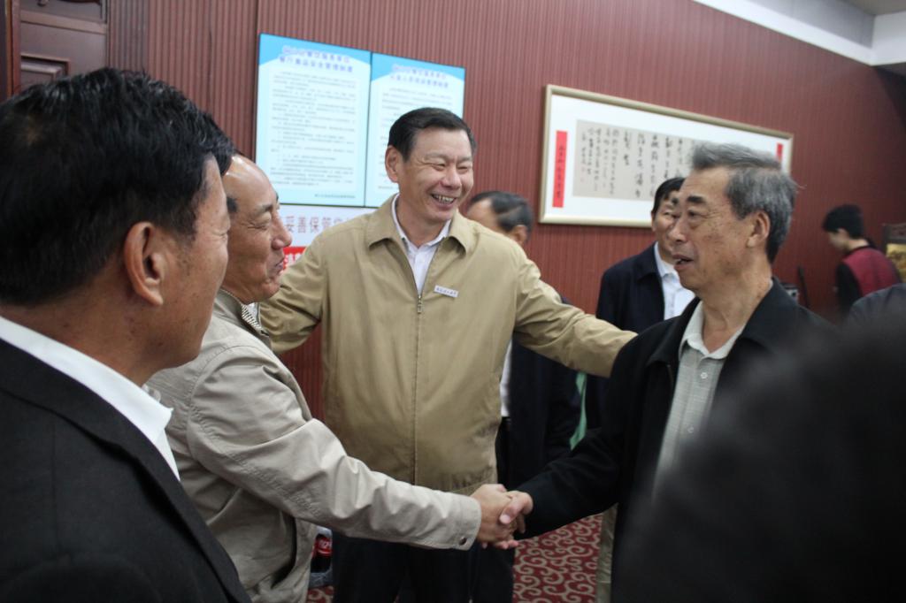 校党委书记张明旭与龙如银(左二)等校友交谈