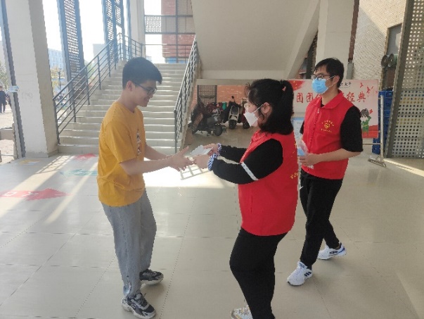 运动结束后,我穿上“智行志愿服务队”的红色小马甲,和小伙伴们一起在食堂门口为来往未佩戴口罩的同学发放口罩。“同学你好,为了你的安全,请佩戴口罩!”这段时间,随着同学们的防疫意识提高,大家进出都养成了戴口罩的习惯了。相比于封控初期同学们紧皱的眉头,我看到现在同学们的眉眼中更多的是闲适、活力与希望。